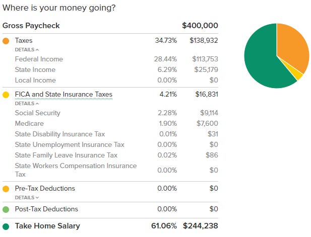 Take the above from NYC. Making $400,000 is over $25,000 in state taxes. Assume you just put that money into the S&P 500 instead? Well, you’re *liquid* you don’t have to wait until you’re 60 years old AND it’s more money than the max!