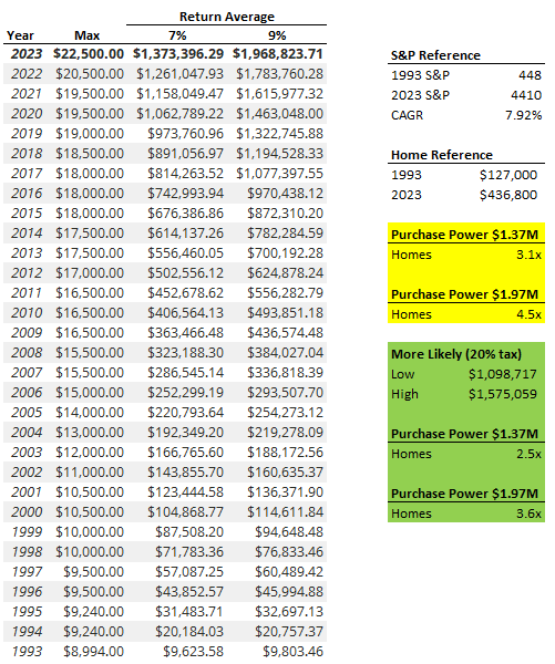 30 years ago was 1993. Today is 2023. We have all of the maximum limits here (source). Below is the official number after 30 straight years of perfect performance and 7% or 9% returns.