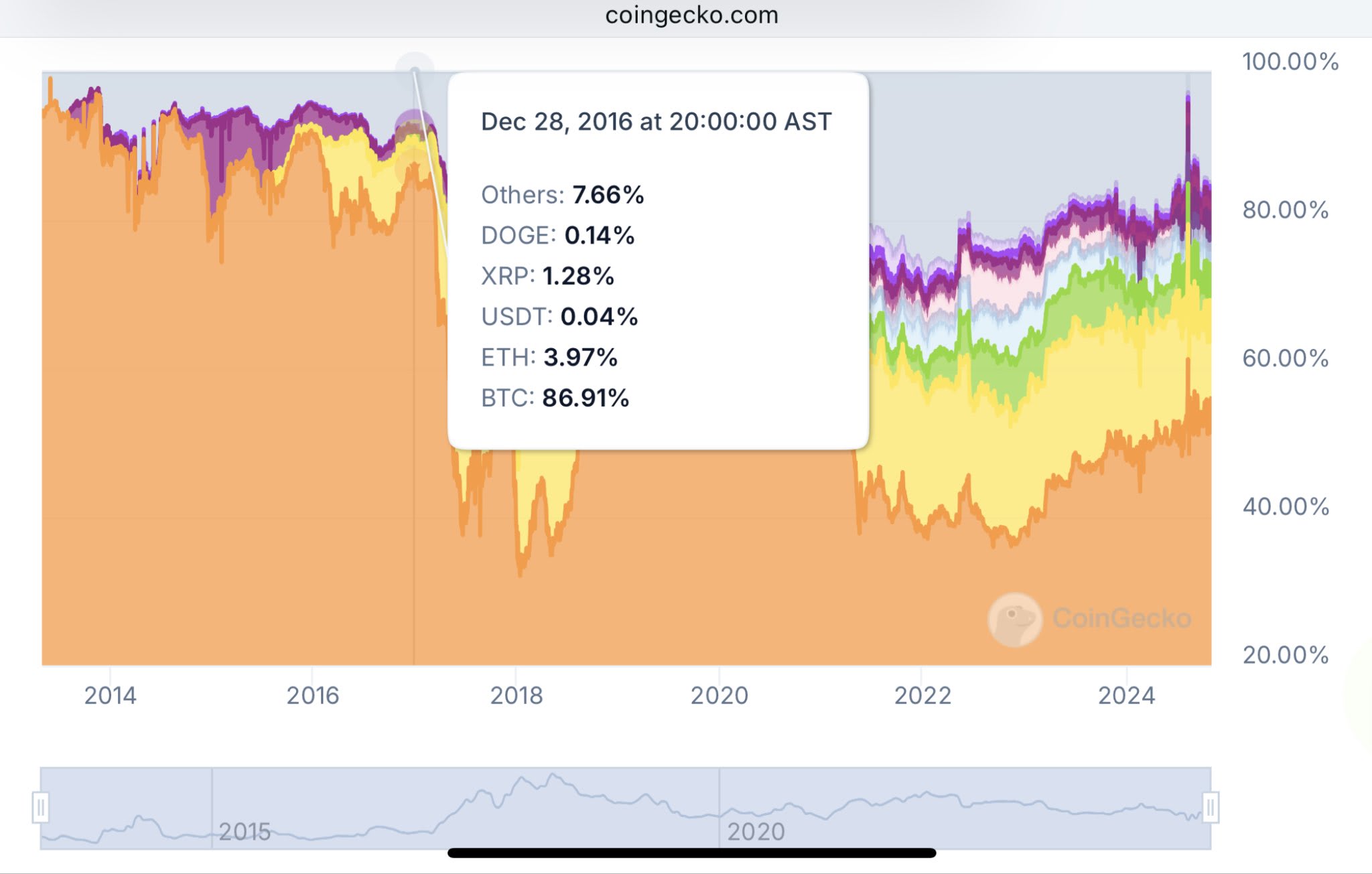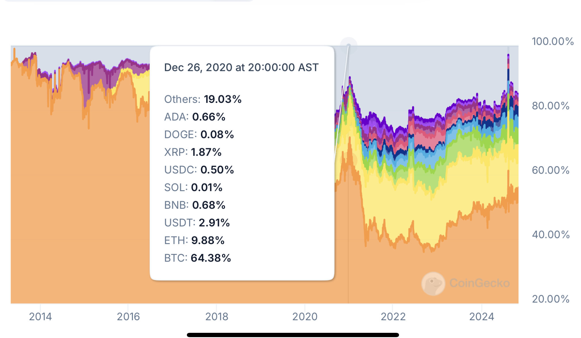 Standard Cycle: Unlike other industries since the emissions for BTC are on a standard 4 year halving, the supply demand imbalance flows through every 240 days or so. Exact day metrics are largely meaningless but you can see from the above that the 3rd year post halving is typically when we see BTC dominance spike. After that new products and innovation are funded (alt coins, smart contracts etc.) and we get into mania season.
