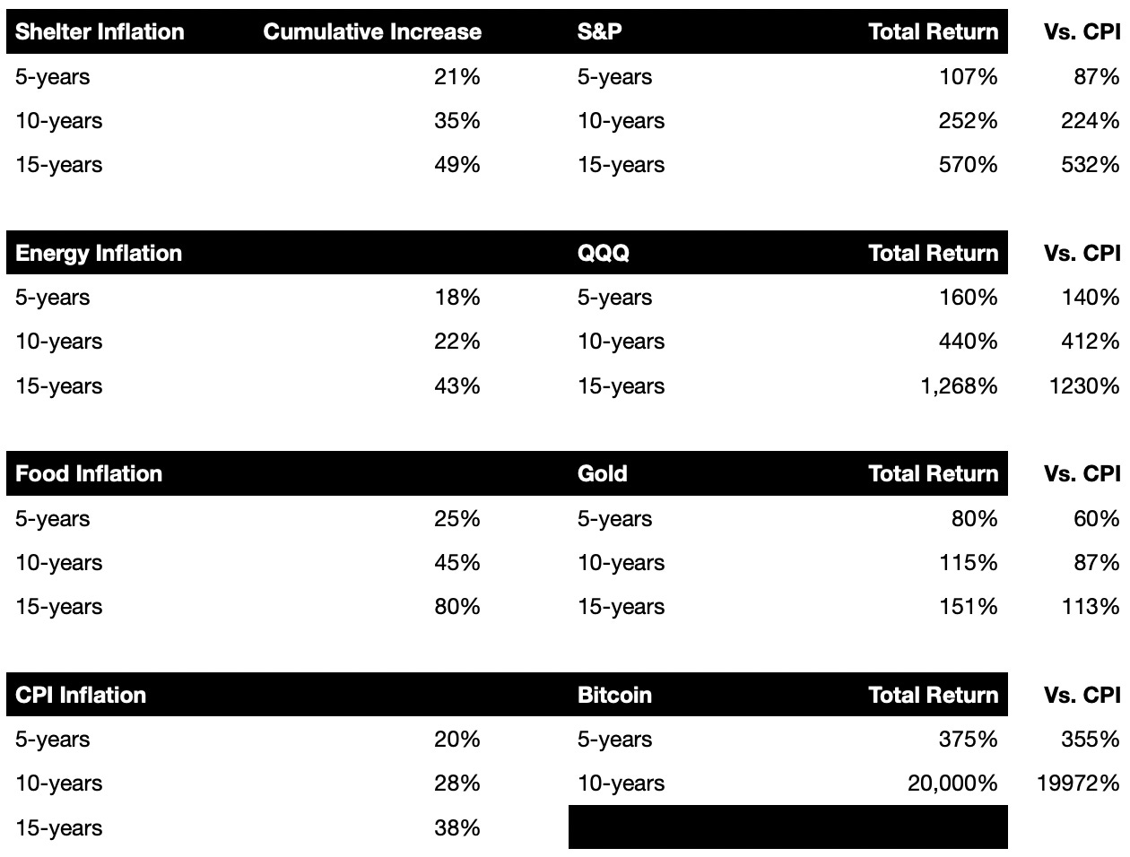 This would mean that Shelter costs are up 35%, Energy up 22%, Food up 45% and CPI is up about 28%.