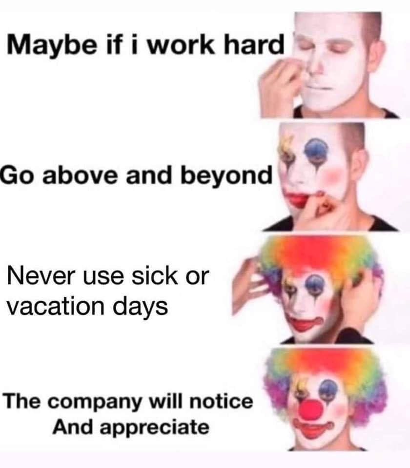 At this point, this meme should be enshrined in a temple somewhere in the Himalayas. A good reminder that you’re just a line item in an excel spreadsheet. A number with revenue minus your salary = value to the firm. If this is reading red, the C-suite is praying you quit or they find a way to get an automated system to replace you.