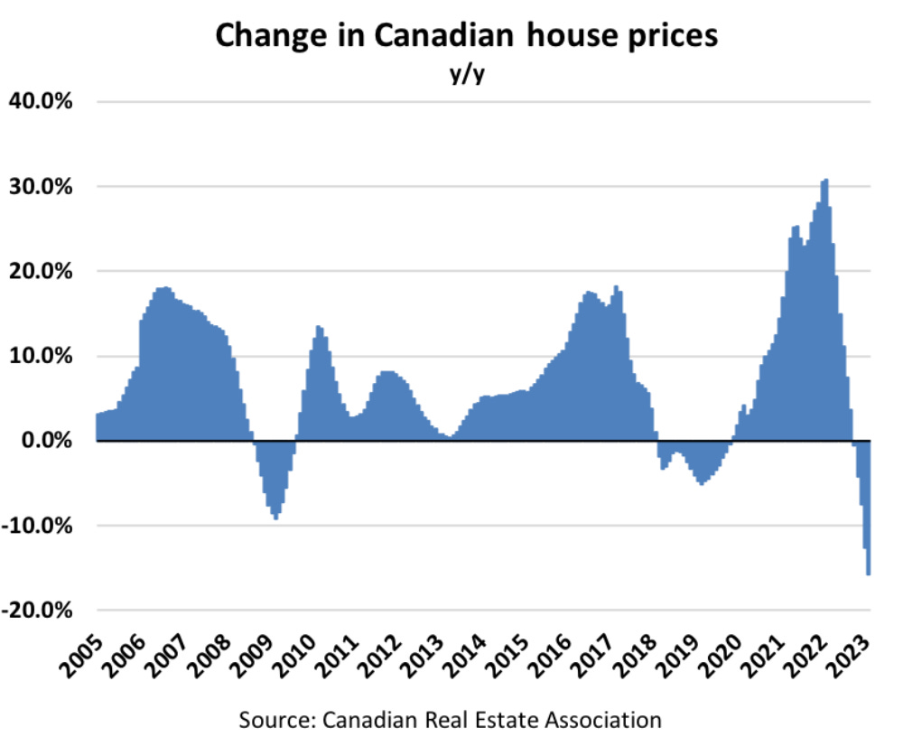 From Q1 2022 to Q1 2023, Canadian house prices fell by the largest amount ever in history: