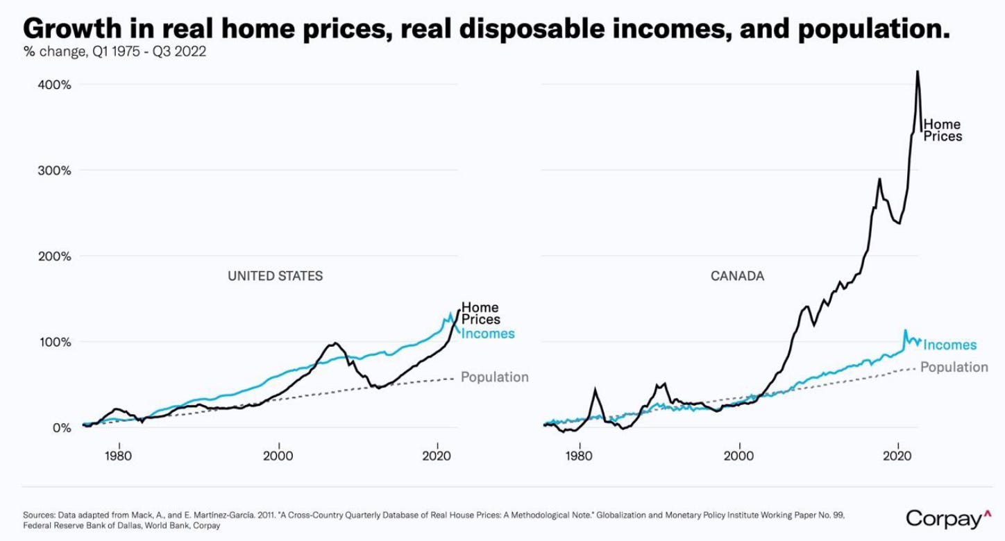 In 2023, a lot of attention has been given to the housing situation in Canada, and rightly so. Since the global financial crisis, real house prices in Canada have vastly outpaced the growth of the US. Beyond that, they’ve also outpaced the growth of another key component – household incomes