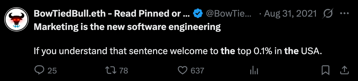 Now you all understand what it means! The idea that marketing/attention is the new software engineering went viral about a week ago. Luckily you already knew that.