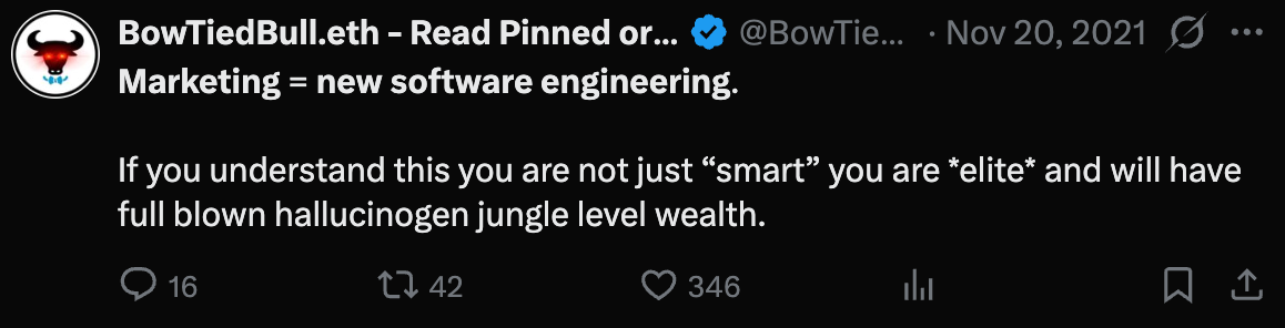 Starting the jungle wasn’t a joke at all. In fact it’s a survival tactic and is continuing to work as expected. Tons of people come and go (grave dancing/quitting) and the top just get bigger and bigger and bigger every single year. Not there yet, but insanely promising. If we know that the majority are NGMI, it doesn’t surprise us that we’ll be a niche community (the whole point if you understand that marketing = software engineering now)