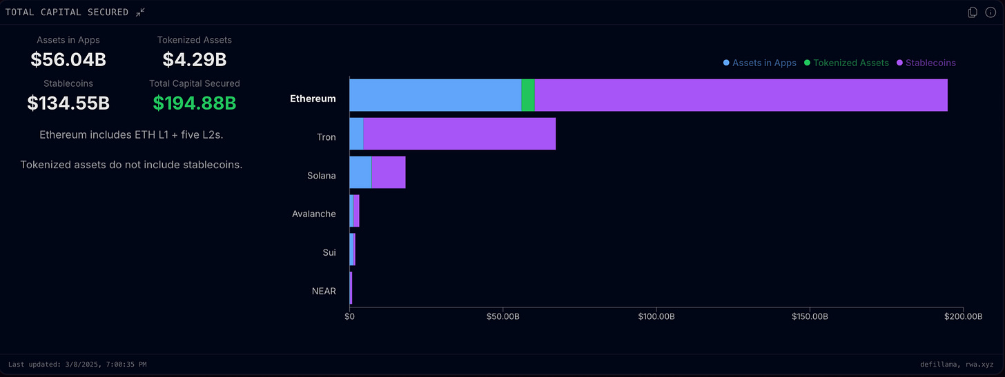 The Ethereum economy (consisting of Ethereum plus its Layer Two blockchain ecosystem) secures the most stablecoins, the most tokenized assets, and the most high-value financial applications of all blockchain ecosystems.