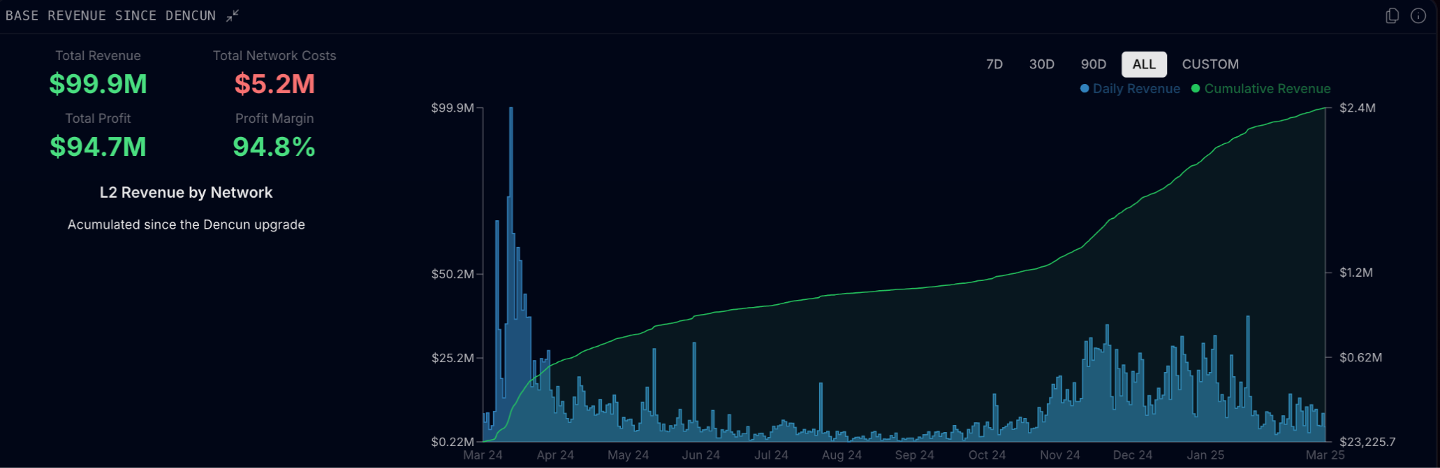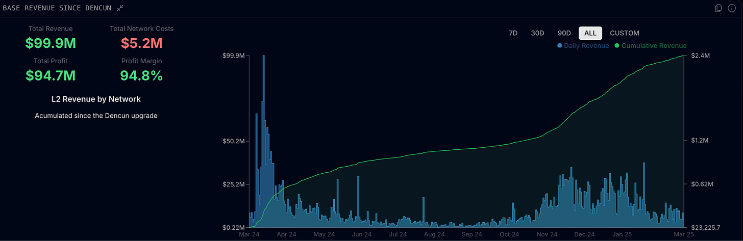 Point (1) is short-sighted. Ethereum scaled itself so that corporations, institutions, governments can deploy L2s on Ethereum in a very profitable way. And this is a good thing - L2s should make a lot of money! Base’s annualized revenue and profit margins are highlighted below.