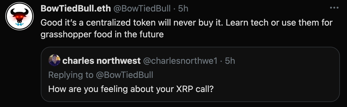 We recognize the token may go up and down. Our goal here is to make you technically savvy *and* a sovereign individual. Ripple is not that. In fact there was a hilarious twitter interaction that we will delete later. The interaction was absolutely perfect and you can decide who you want to listen to. 2035 Cartoon bull vs…..