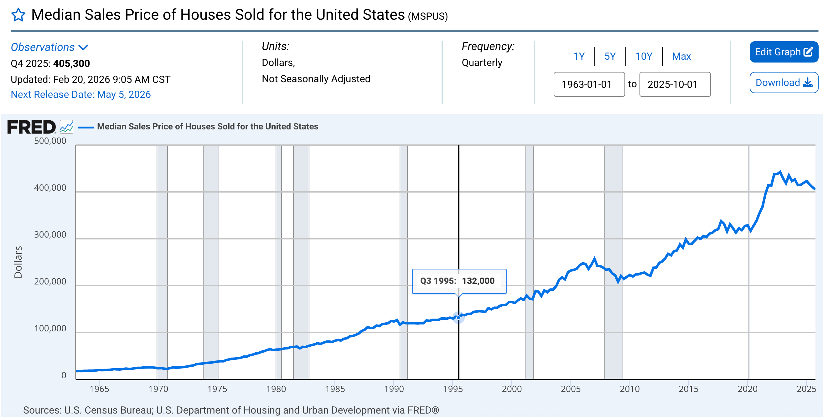 Think about it. If you understand that the money printing will never stop, you should not measure your net worth based on dollars in a checking account. Your net worth should be measured based on what you can purchase. If you were worth $1.3M in 1995, you could buy 10 houses. In 2026 you could buy 3 and have 5-figures in a checking account. That’s it. A ~70% difference.