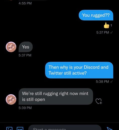 NFT Rugs: Another fun one? Watching scammers publicly rug as well. This is a larger scale scam. Instead of targeting a group of people (such as our community or another community) there are individuals who are running larger scale scams. They big up an account create hype and then just collect a bunch of SOL/ETH/(token) and ditch. Many NFT cash grabs to steal your ETH/sol/(other token).