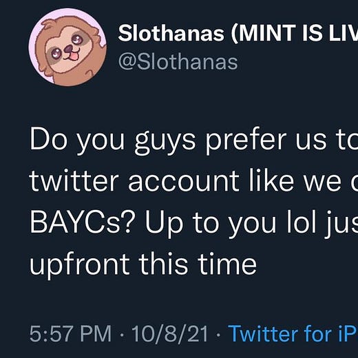 The most interesting thing is seeing how much people are paying for NFTs that will go to zero. NFTs don’t have value unless they offer: 1) utility, 2) access or 3) prestige/flex. Without one of the three it’s difficult to see why anyone would purchase one. You’re effectively giving up ETH as a charity. This is fine if you want to donate money but don’t think for a single second that it will be worth anything in 12 months.