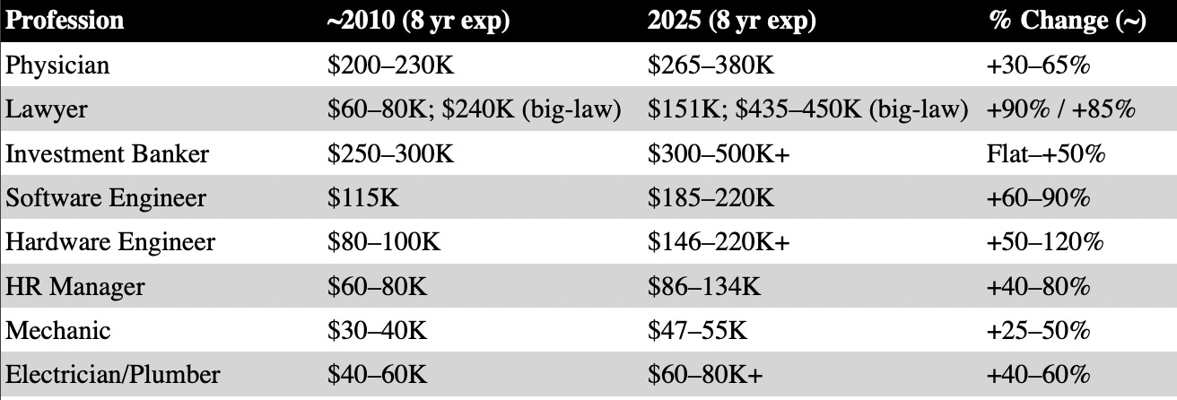 Woof. As you can see, it is tough to get ahead with W-2 earnings. All of this is *pre-tax* income. As you move up from $150K to $300K, the tax man is going to take more of it as a percentage (not less!). Either way, just left it as pre-tax since some exception to the rule guy will claim that taxes are going to plummet.