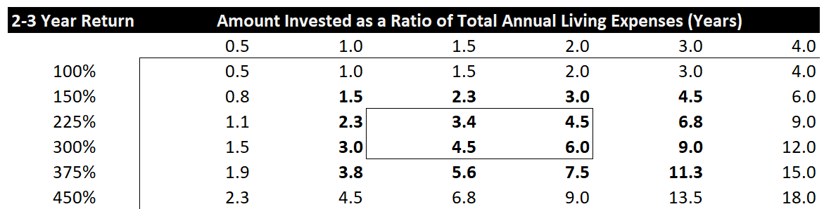 In this case just look at column two (labeled as 1 year). If you put one year of spending and are right, you’re looking at three years of total time purchased (300% return). That is an absurd move in the right direction. If you look at the extreme case (4 years) you’re half way to financial independence in 2-3 years.