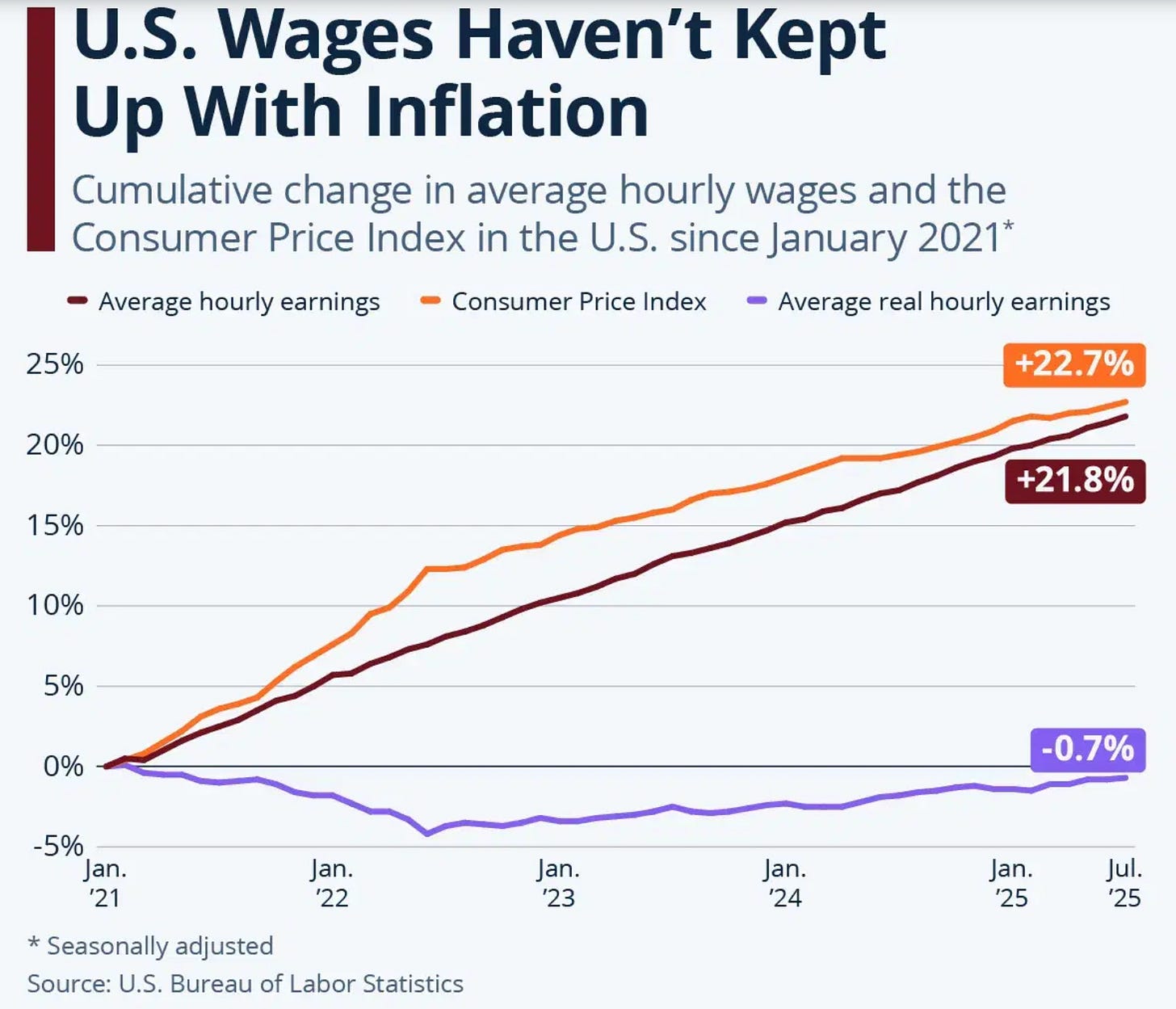 Recent data through 2024–2025 shows episodes where CPI rises outpaced real wage gains.