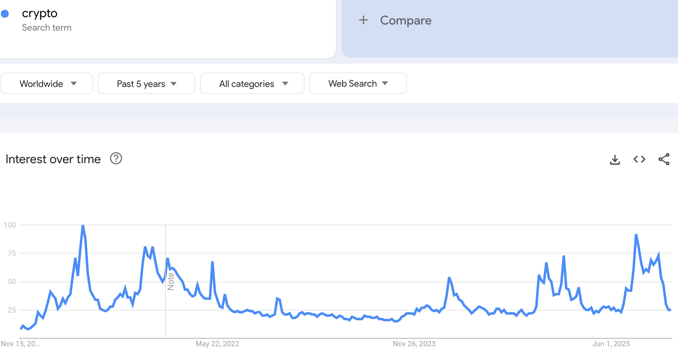 Welcome Avatar! Has been a psychologically painful week based on what we’re seeing on X-app. The amount of interest in crypto and even tech has plummeted all in the past 10 days or so. The below three terms are probably a good gauge of retail sentiment.
