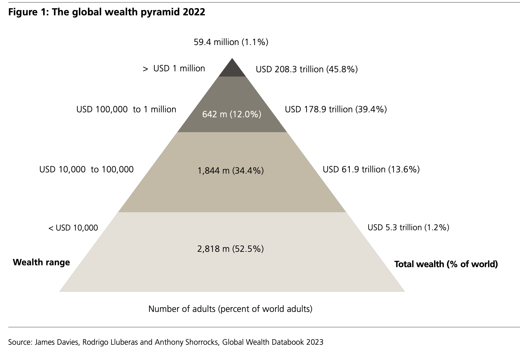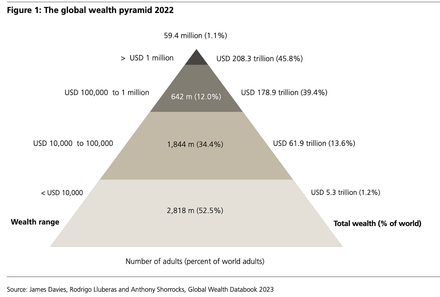 Before moving on, if you are worth over $1M, you are in the top 1.1% of the world. Part of a group that controls 45.8% of the wealth.