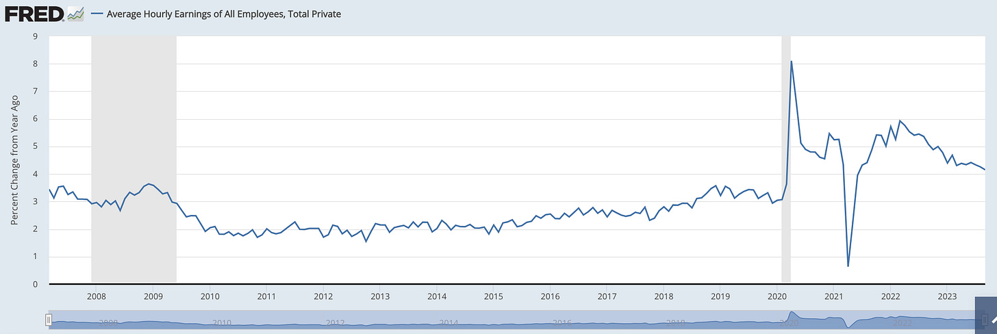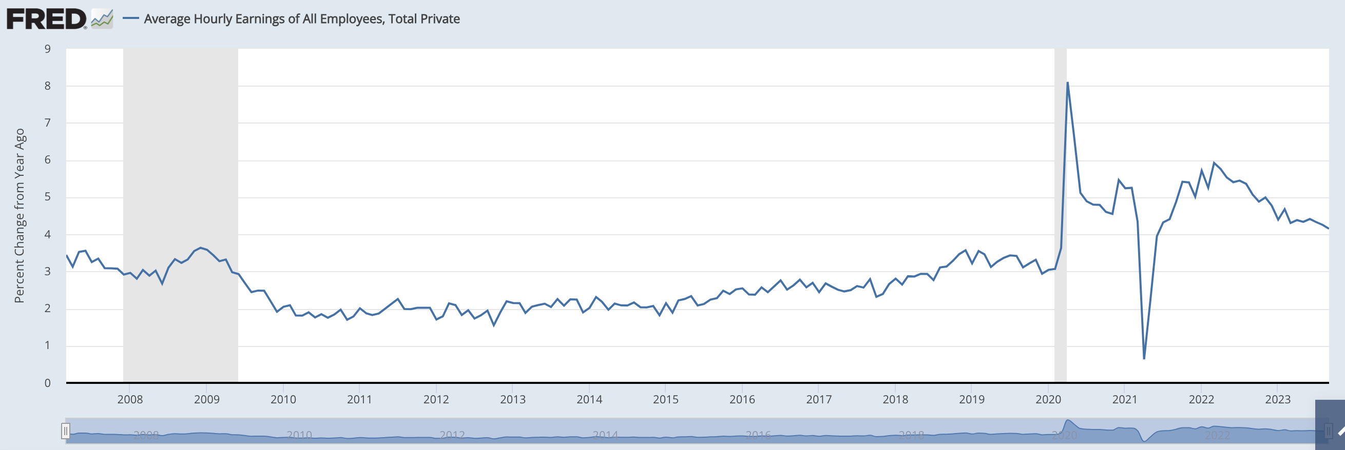 Check the chart out. There is no need to calculate the exact number. If you look at it, there is one anomaly up and one anomaly down. Go ahead and average them out, what do you see? You see average earnings going up y/y by about 3% on average.