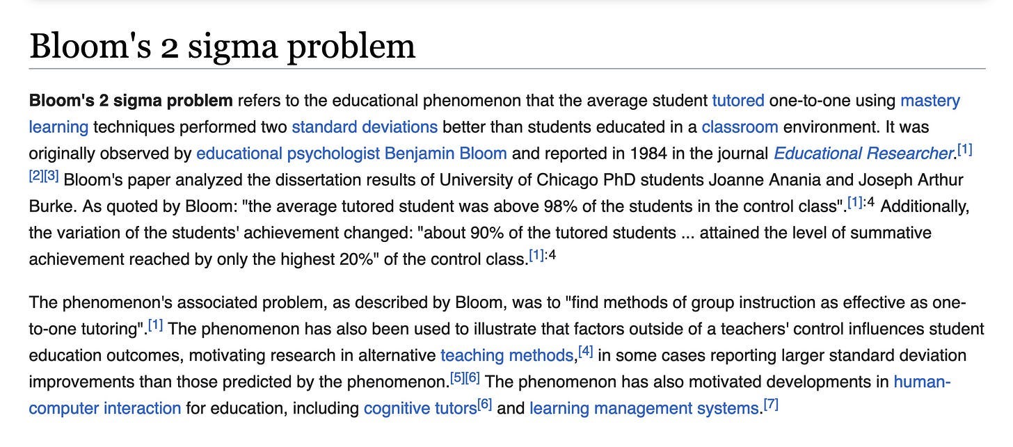 AI was a nuclear bomb on education, but people are more worried about automation. It isn’t a big deal because of its output, but rather because of “Bloom’s 2 Sigma Problem”