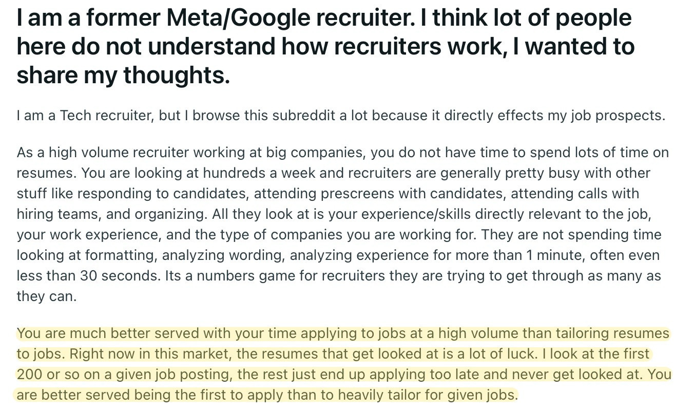 The lowest-hanging fruit is the easiest to automate. This is the work which inexperienced, junior candidates have been doing. It’s easier, cheaper, and faster to prompt an AI than it is to explain a basic task to a junior