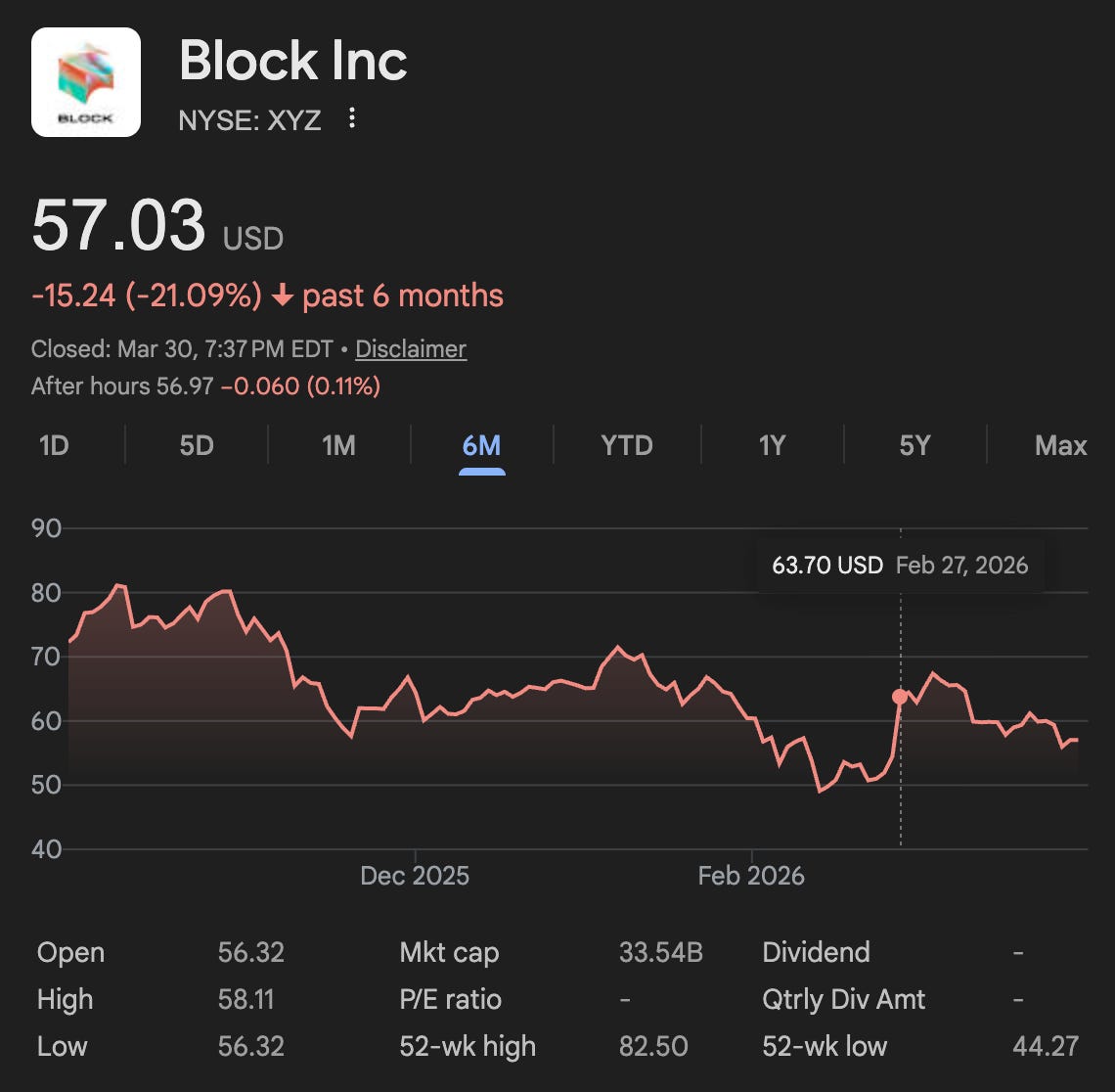 Can You Really Blame the CEOs? When Block announced a significant headcount reduction, the stock rallied 20%+ and is the only reason it is holding up ytd vs. the vast majority of high beta tech stocks.