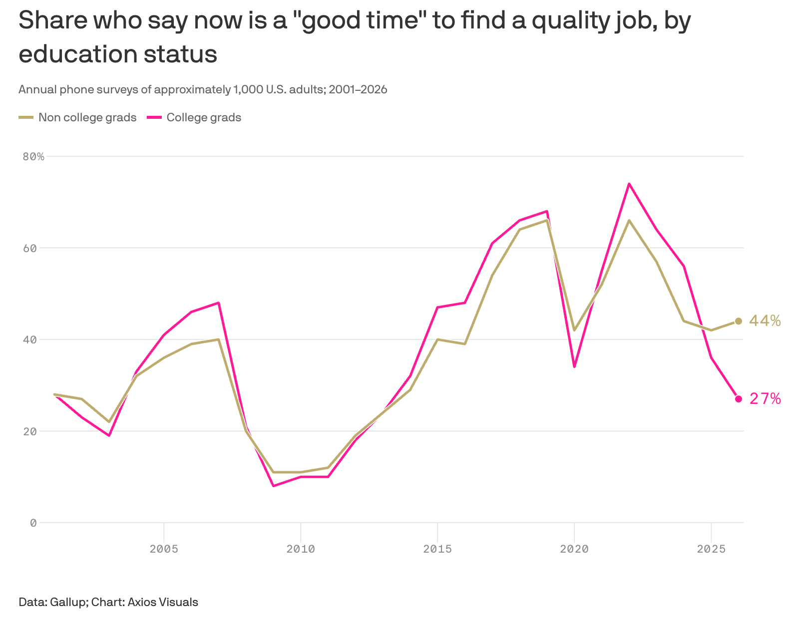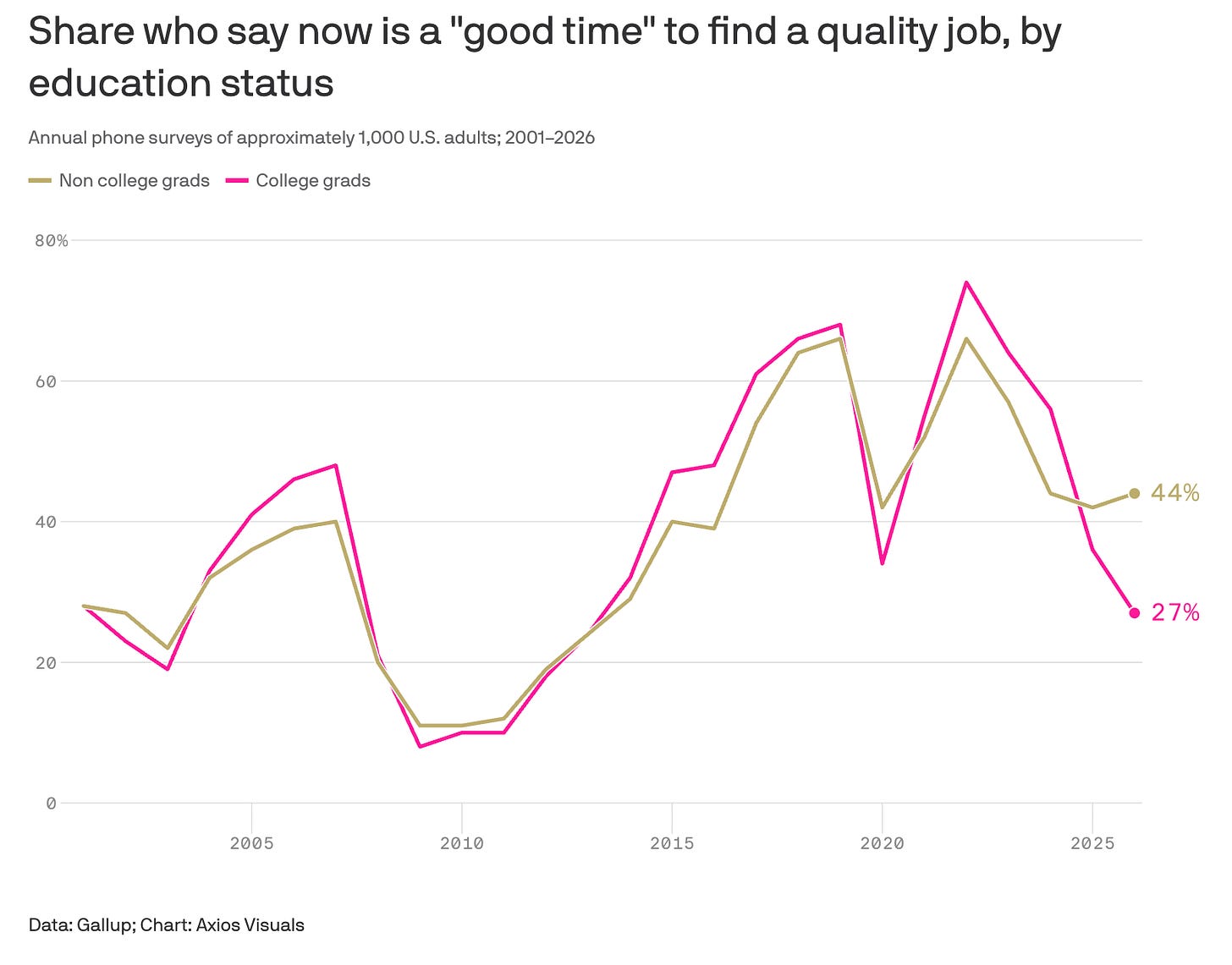 Gallup reported that ~27% of college grads said it was a good time to find a quality job (March 2026). This is the lowest reading in over a decade. Hiring is also down about 20-30% depending on the industry. All of this lines up with tech innovation since technology is designed to remove human labor. The easier the task (see entry level), the more likely it is replaced by code.
